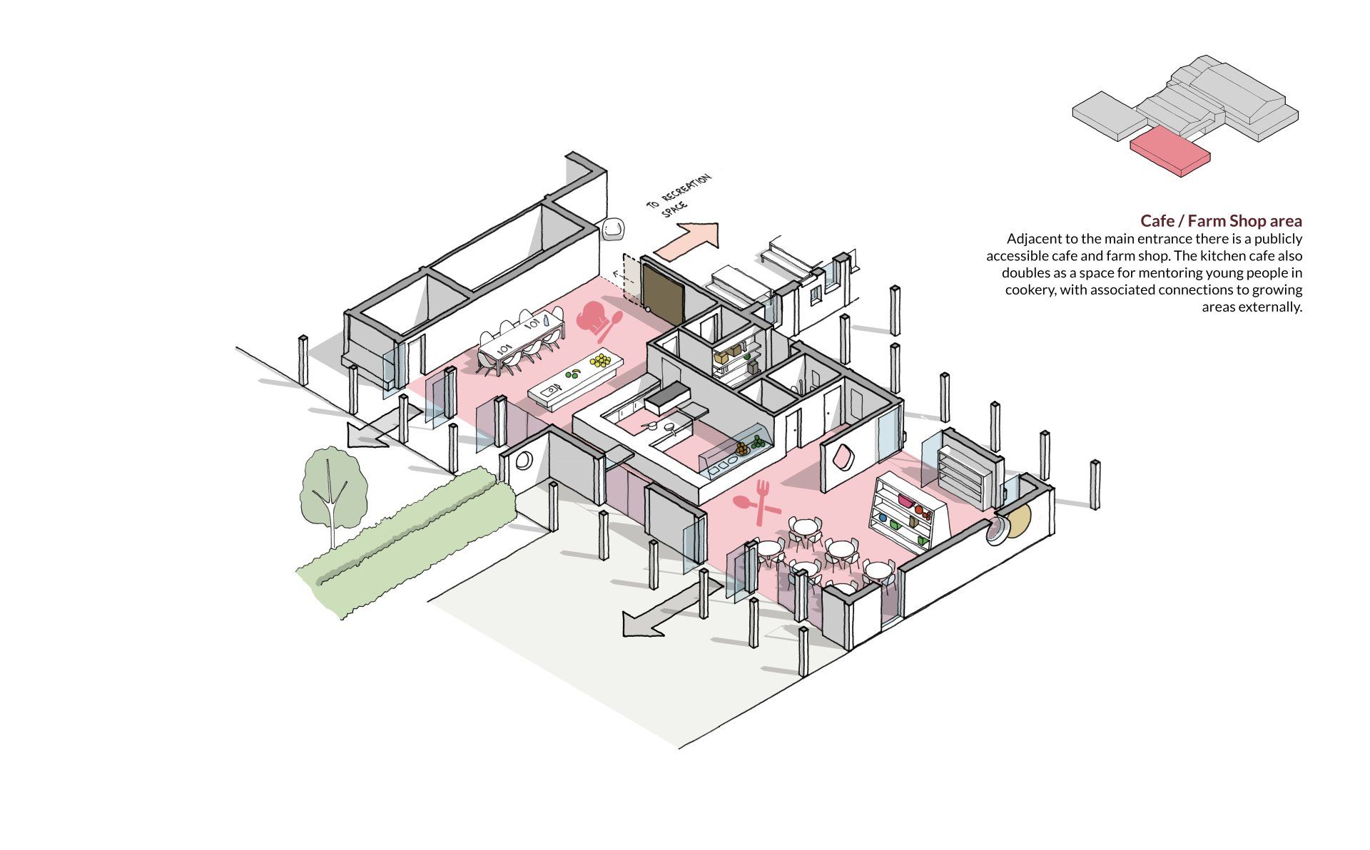 The illustration below shows the building and site layout concept, with the various spaces of the building organised around a central recreation area, with adjacent activities positioned to create two sheltered courtyards, one forming the main entrance area off the existing access from New Lane, the other facing into the site, with long views out toward the landscape. The proposed activities immediately around the building compliment, and in some cases are an extension of, the spaces inside the building.