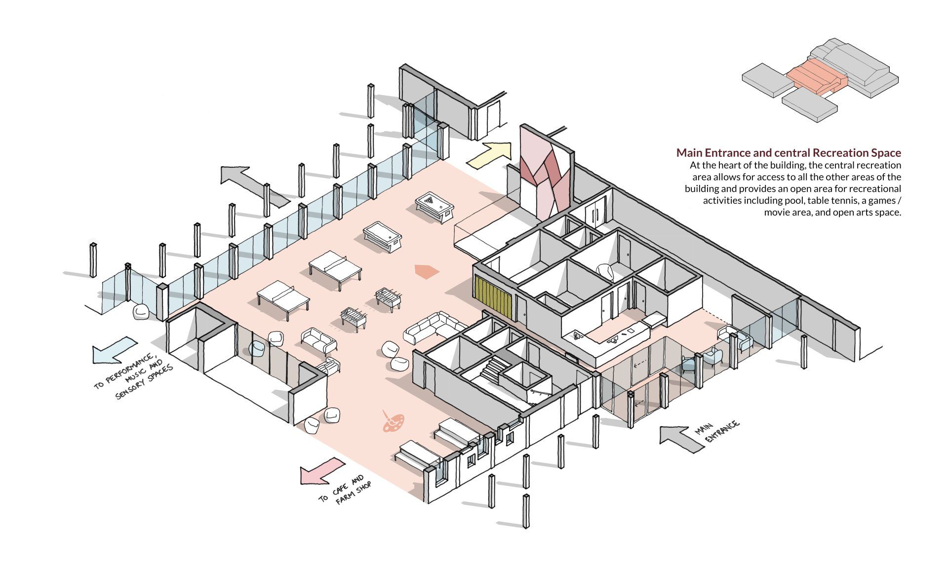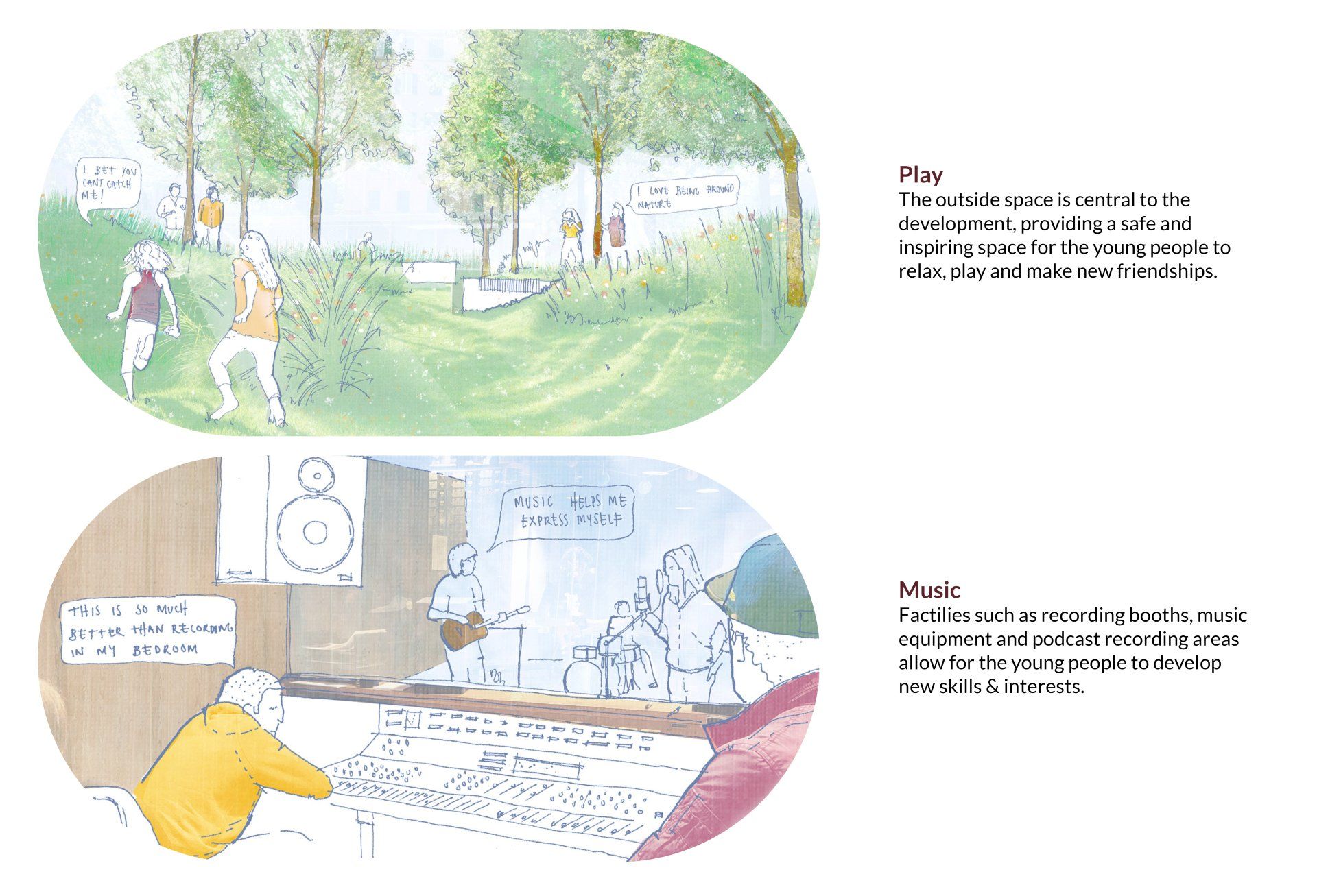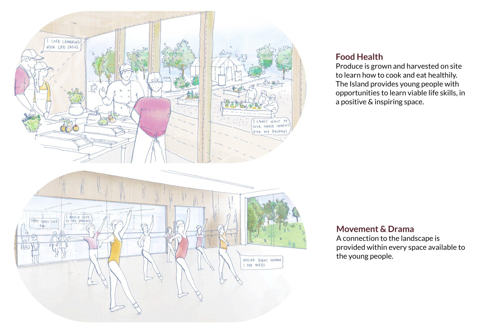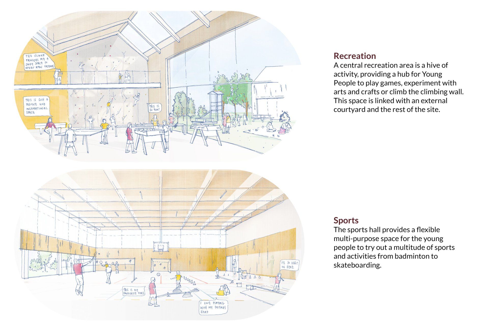 Following the first workshops held with the young people and staff at The Island, a series of early vision sketches captured the essence of some of the key spaces and activities within the proposed new building and site.