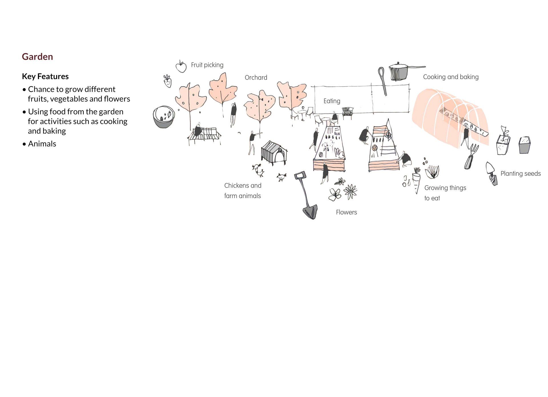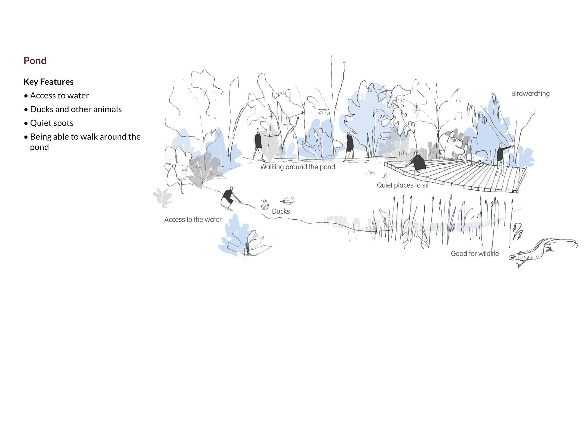 Five key habitats will form the basis of the site: Park, Garden, Meadow, Woodland and Pond.
